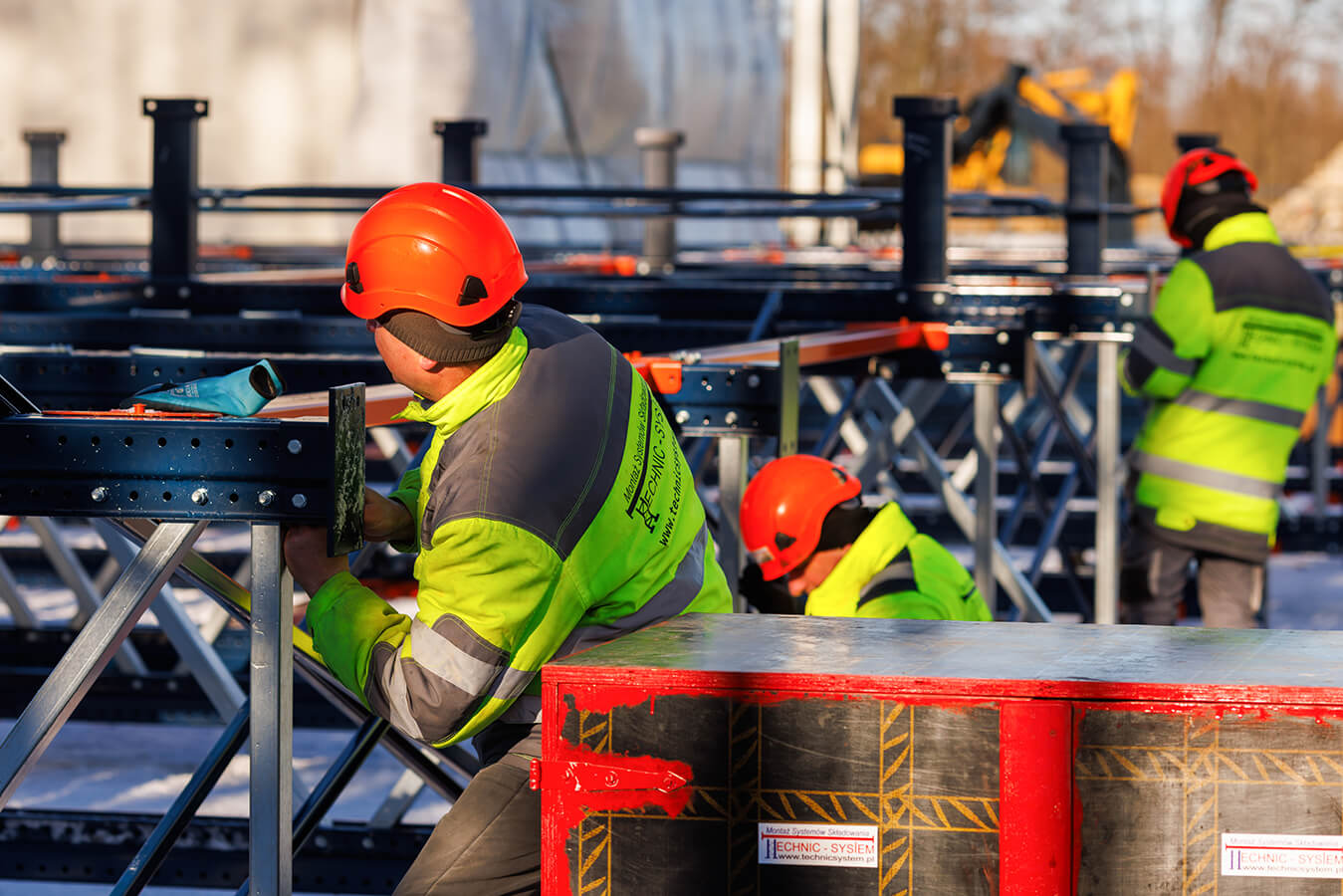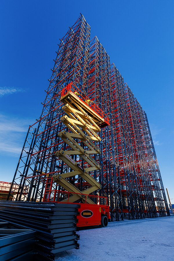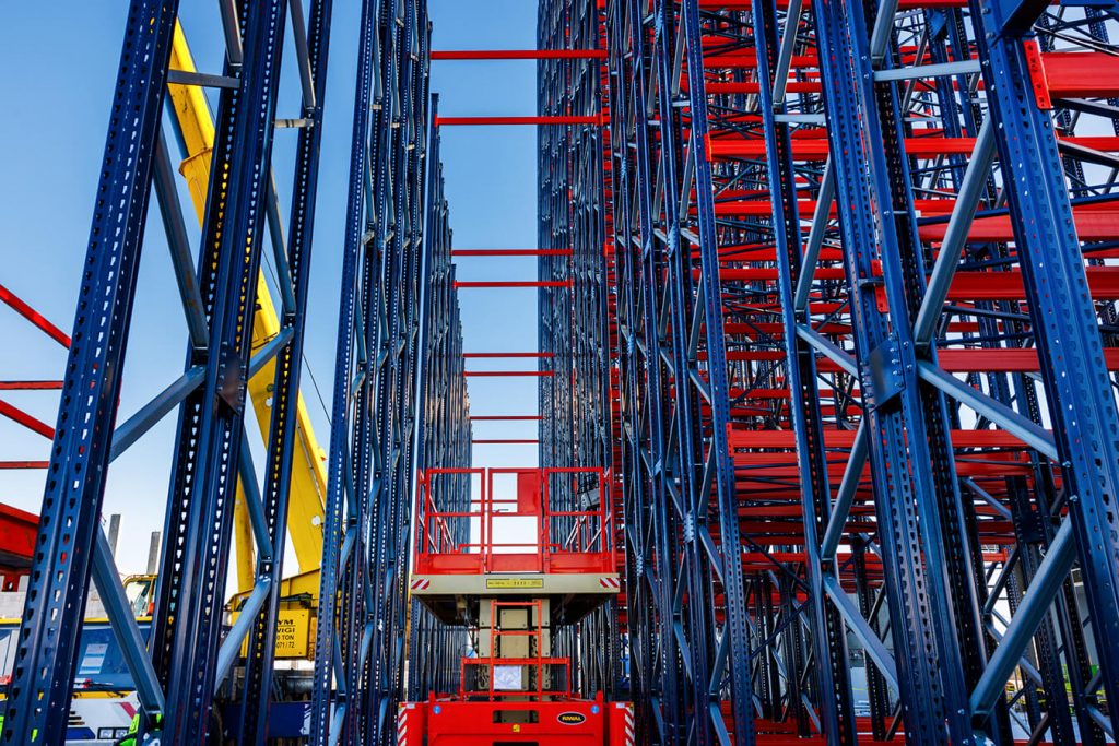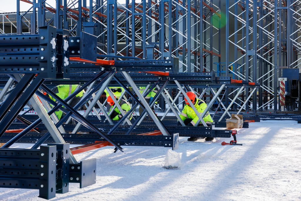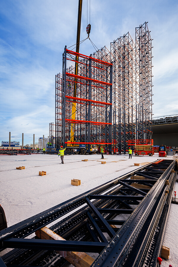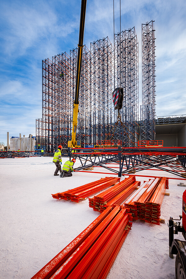 Na budowie centrum dystrybucyjnego z mroźniami dla Frigo Logistics, w Nowym Dworze Mazowieckim trwa montaż specjalnych regałów przyszłego, w pełni zautomatyzowanego magazynu wysokiego składowania z temperaturą do -24st.C. Regały, poza funkcją składowania, będą stanowić konstrukcję przyszłego budynku, dlatego montujemy je przed postawieniem ścian i przed pracami dachowymi. Docelowa wysokość budynku: 36 m.