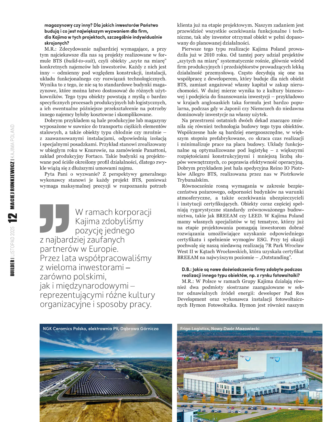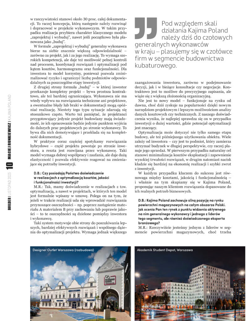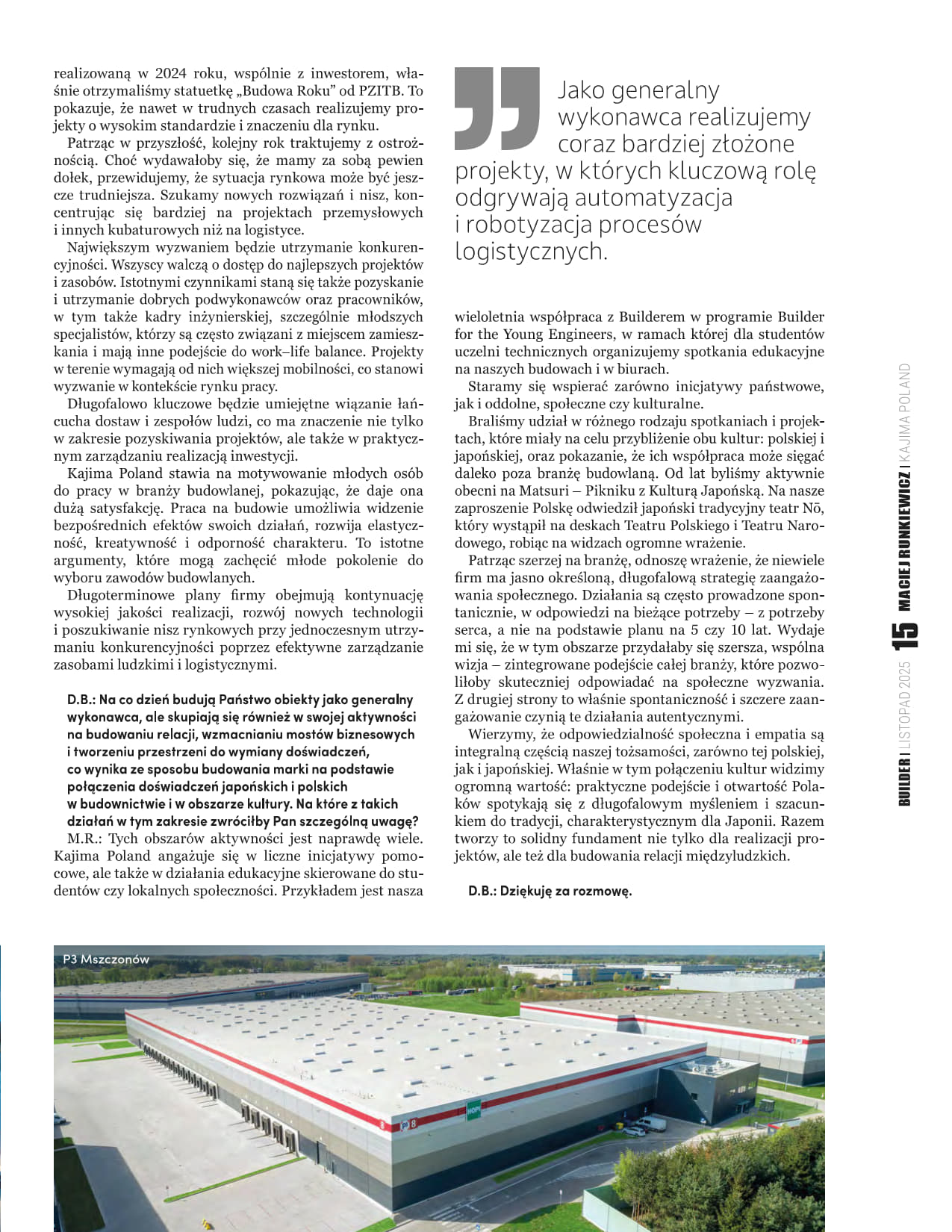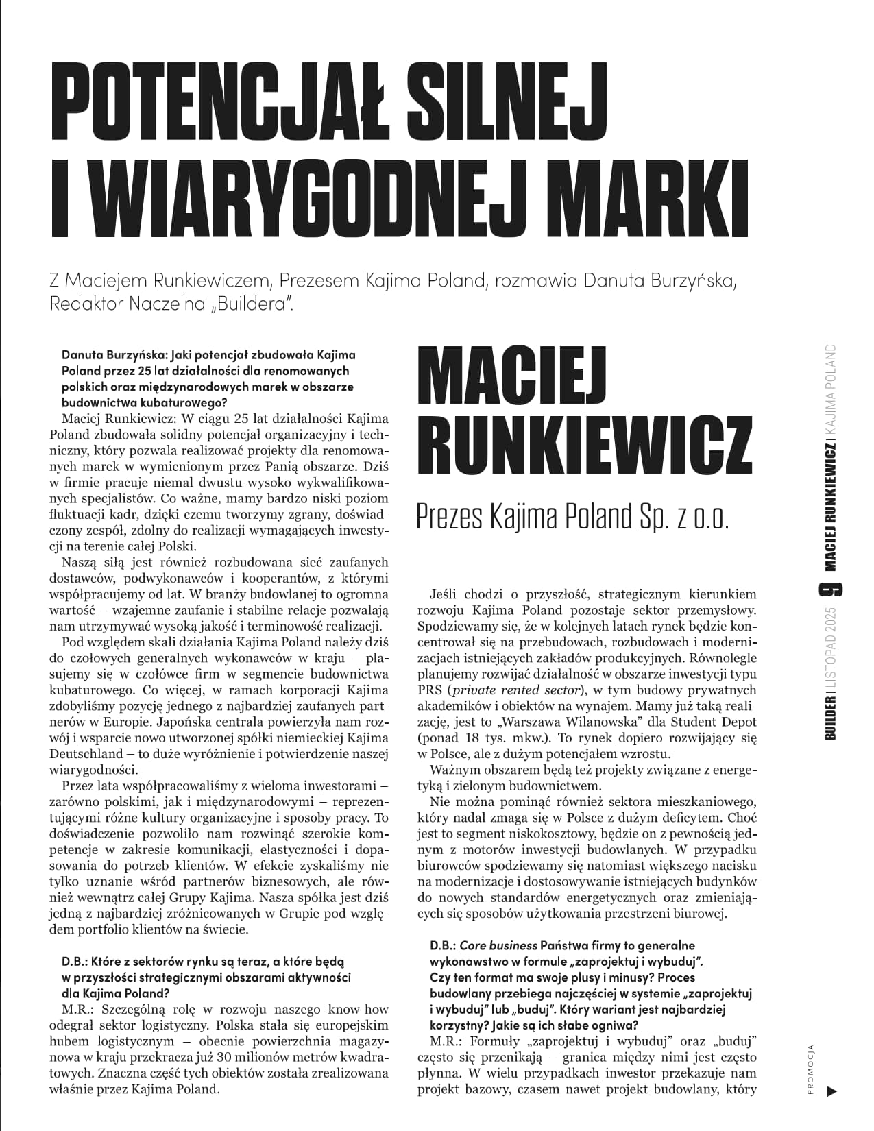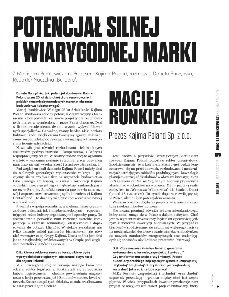 25 lat doświadczeń, stabilny zespół i umiejętność adaptacji to fundamenty, które wprowadziły firmę do czołówki nowoczesnego i zrównoważonego budownictwa w Polsce. Builder Polska rozmawia z prezesem Kajima Poland Maciejem Runkiewiczem o strategii firmy, kluczowych obszarach rozwoju i przyszłości sektora budowlanego. Zapraszamy do lektury.