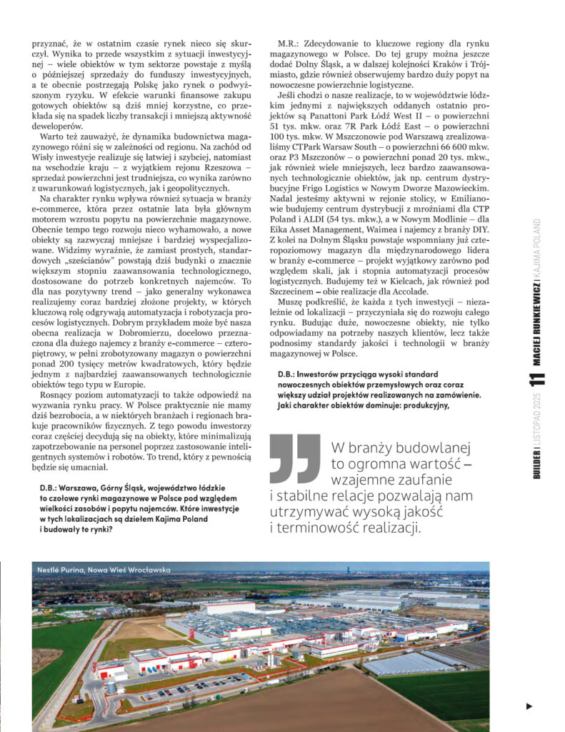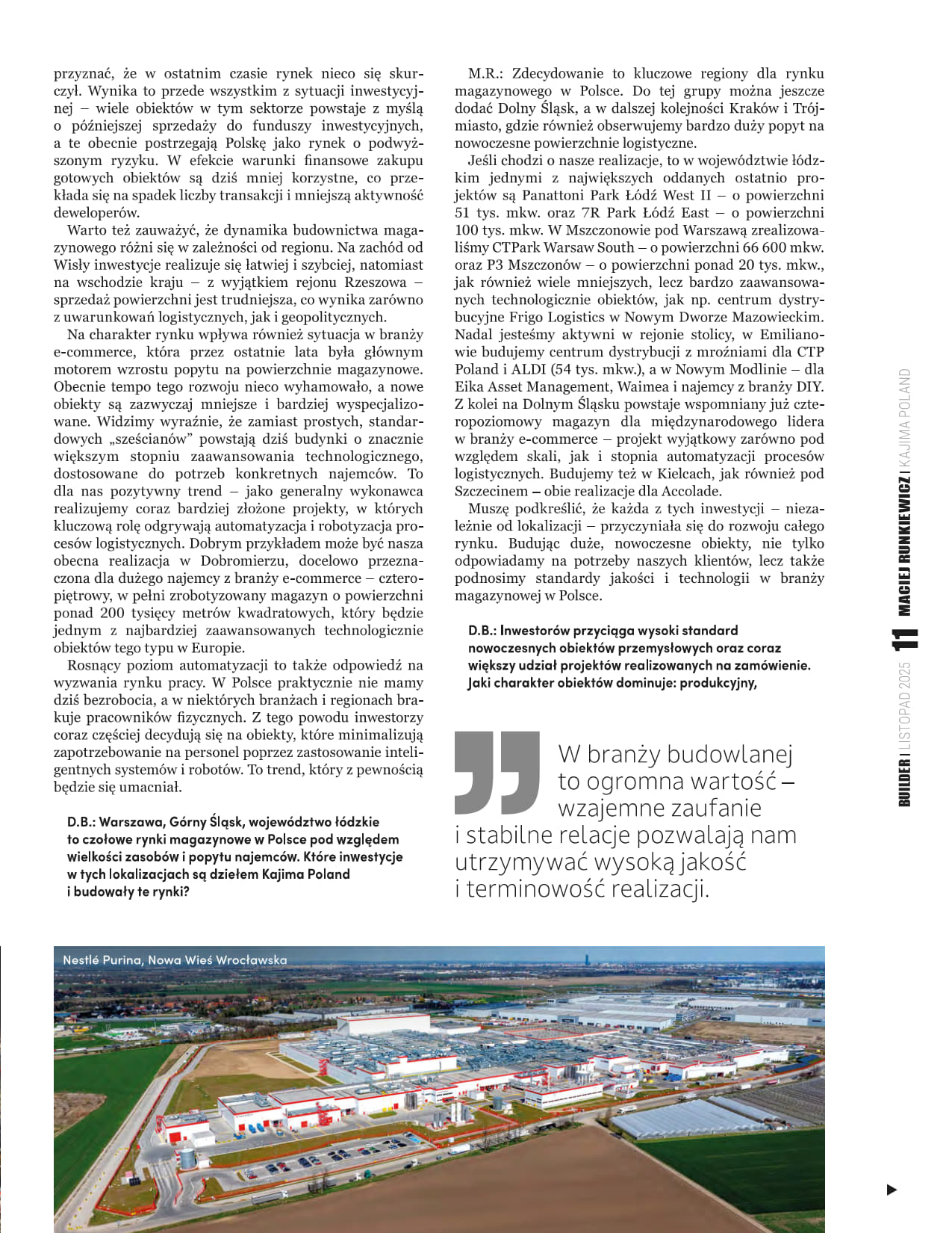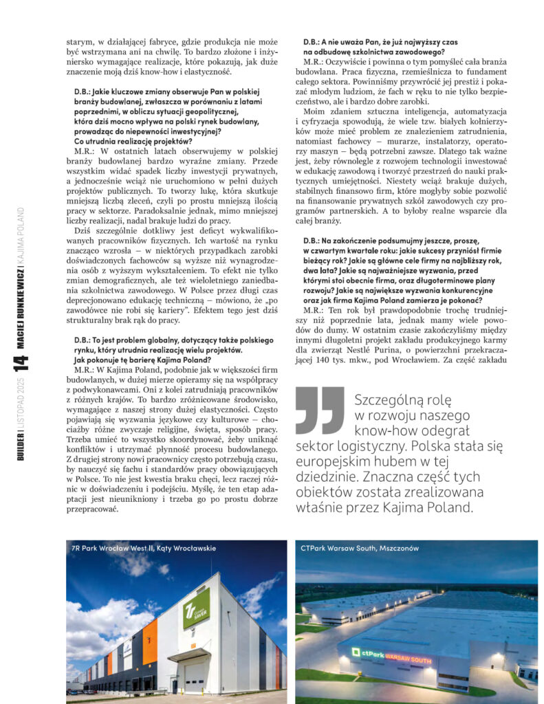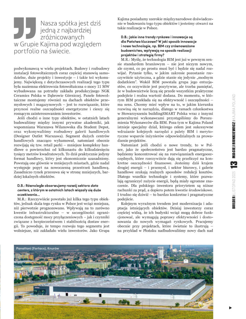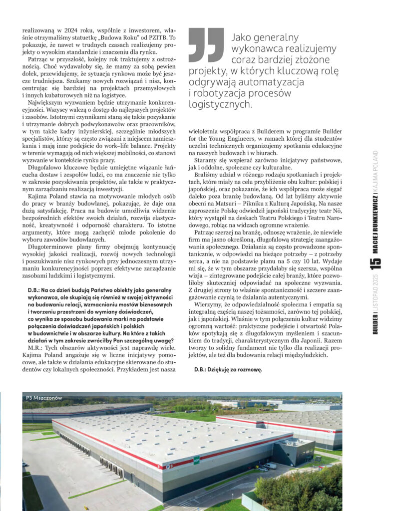 25 lat doświadczeń, stabilny zespół i umiejętność adaptacji to fundamenty, które wprowadziły firmę do czołówki nowoczesnego i zrównoważonego budownictwa w Polsce. Builder Polska rozmawia z prezesem Kajima Poland Maciejem Runkiewiczem o strategii firmy, kluczowych obszarach rozwoju i przyszłości sektora budowlanego. Zapraszamy do lektury.